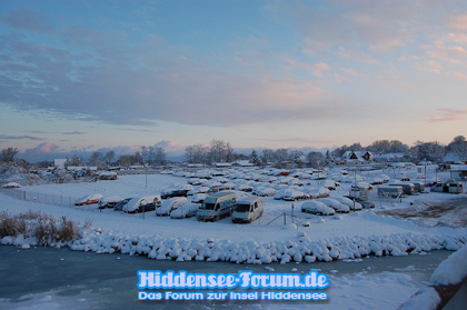 Blick auf den verschneiten Parkplatz von Schaprode
