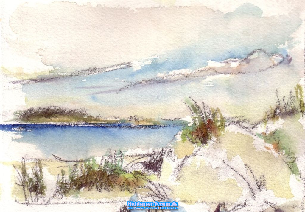 Kleine Skizzen Aquarell über Bleistift von dem Aussichtsturm der Hohen Dünen nordwestlich von Pramort. Bei Windstärke um 5 (wenn nicht mehr) war das Malblatt kaum zu halten.